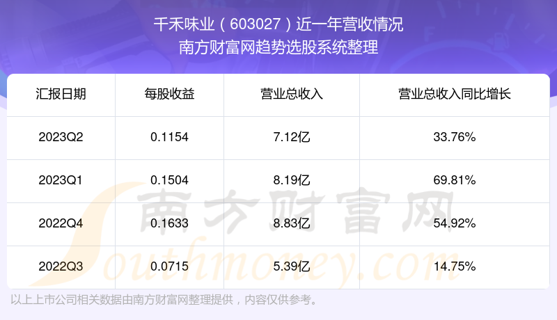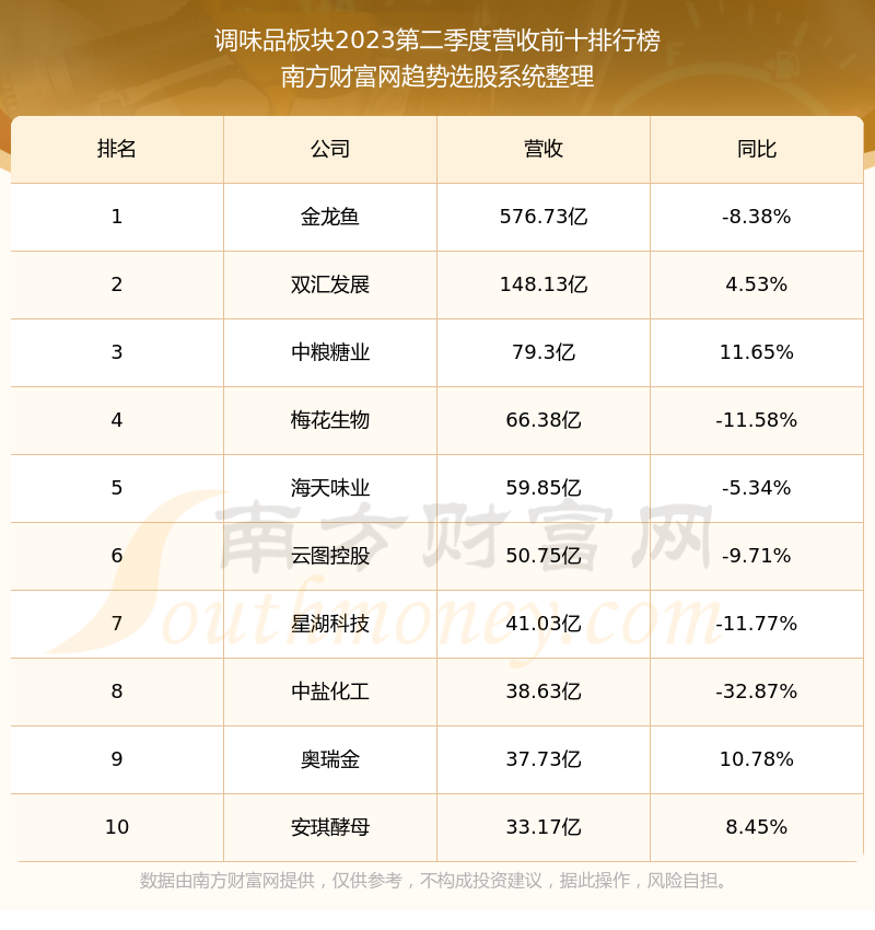 按照南方财富网趋势选股系统统计,该股所属板块为调味品板块,该板块共有53只股票,千禾味业2023第二季度营收在该板块中排名为第29名,该板块2023第二季度营收排名前十的股票如下表: