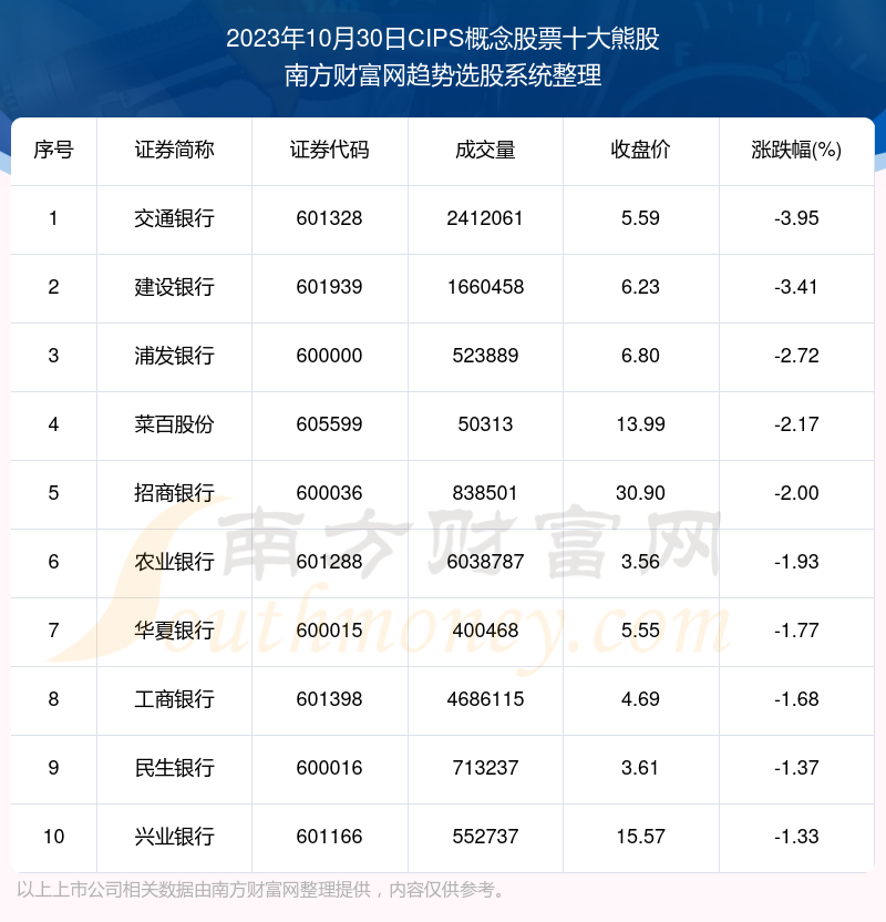 截止2023年10月30日,个股表现方面,CIPS概念股票当日领跌股为交通银行(601328),该股当日报收5.59,上涨-3.95%,成交量241.21万。建设银行(601939)以下跌-3.41%紧随其后,该股当日成交量166.05万。此外,浦发银行(600000)、菜百股份(605599)、招商银行(600036)均进入当日CIPS概念股票熊股之列。