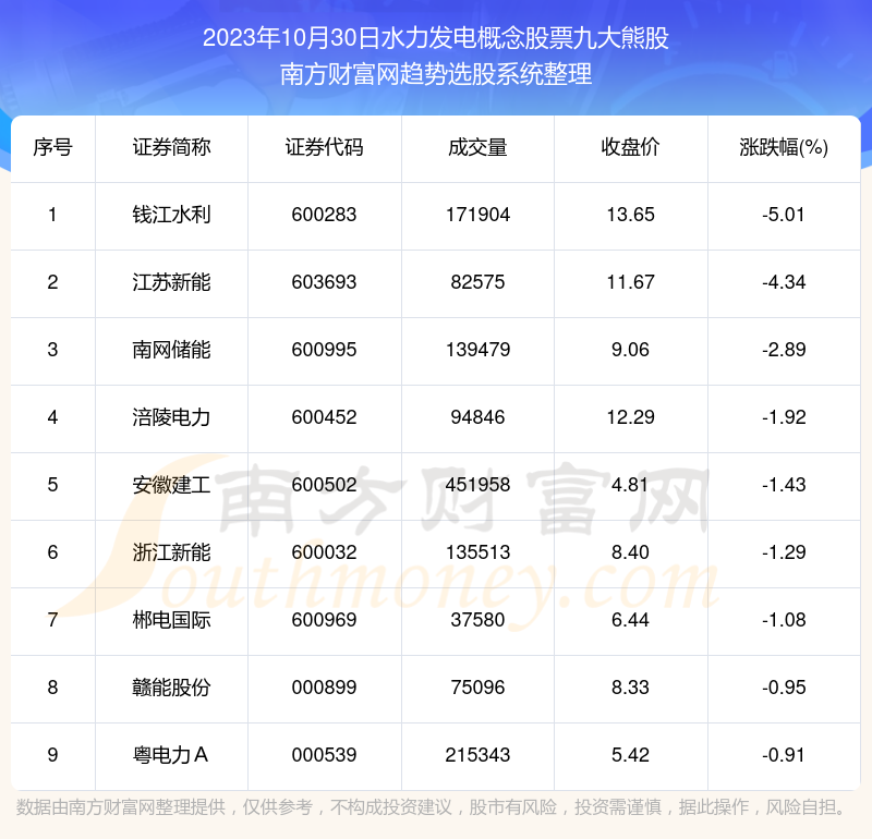 截止2023年10月30日,个股表现方面,水力发电概念股票当日领跌股为钱江水利(600283),该股当日报收13.65,上涨-5.01%,成交量17.19万。江苏新能(603693)以下跌-4.34%紧随其后,该股当日成交量8.26万。此外,南网储能(600995)、涪陵电力(600452)、安徽建工(600502)均进入当日水力发电概念股票熊股之列。