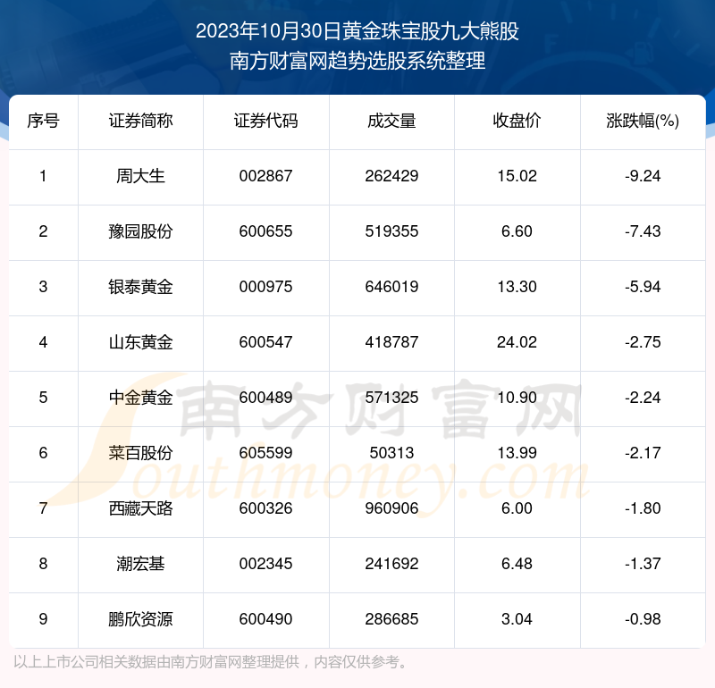 截止2023年10月30日,个股表现方面,黄金珠宝股当日领跌股为周大生(002867),该股当日报收15.02,上涨-9.24%,成交量26.24万。豫园股份(600655)以下跌-7.43%紧随其后,该股当日成交量51.94万。此外,银泰黄金(000975)、山东黄金(600547)、中金黄金(600489)均进入当日黄金珠宝股熊股之列。