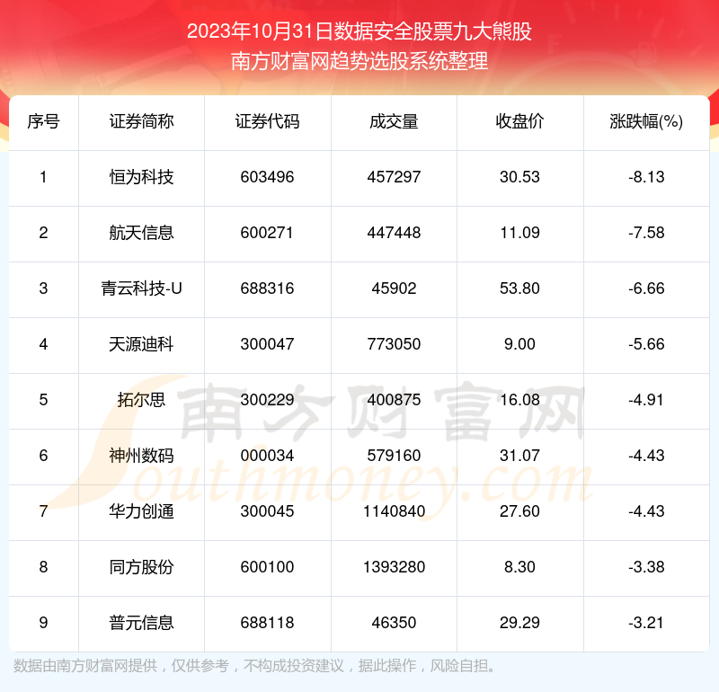 截止2023年10月31日,个股表现方面,数据安全股票当日领跌股为恒为科技(603496),该股当日报收30.53,上涨-8.13%,成交量45.73万。航天信息(600271)以下跌-7.58%紧随其后,该股当日成交量44.74万。此外,青云科技-U(688316)、天源迪科(300047)、拓尔思(300229)均进入当日数据安全股票熊股之列。