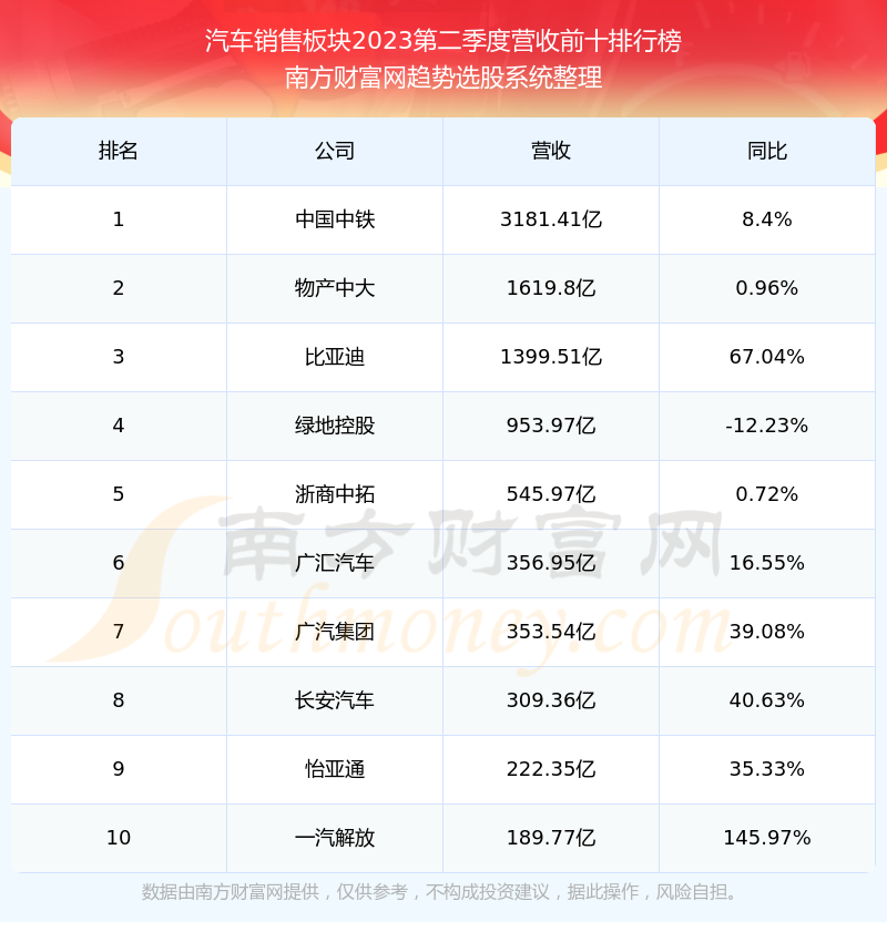 按照南方财富网趋势选股系统统计,该股所属板块为汽车销售板块,该板块共有58只股票,东风汽车2023第二季度营收在该板块中排名为第23名,该板块2023第二季度营收排名前十的股票如下表: