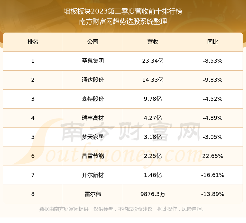 按照南方财富网趋势选股系统统计,该股所属板块为墙板板块,该板块共有8只股票,梦天家居2023第二季度营收在该板块中排名为第5名,该板块2023第二季度营收排名前十的股票如下表: