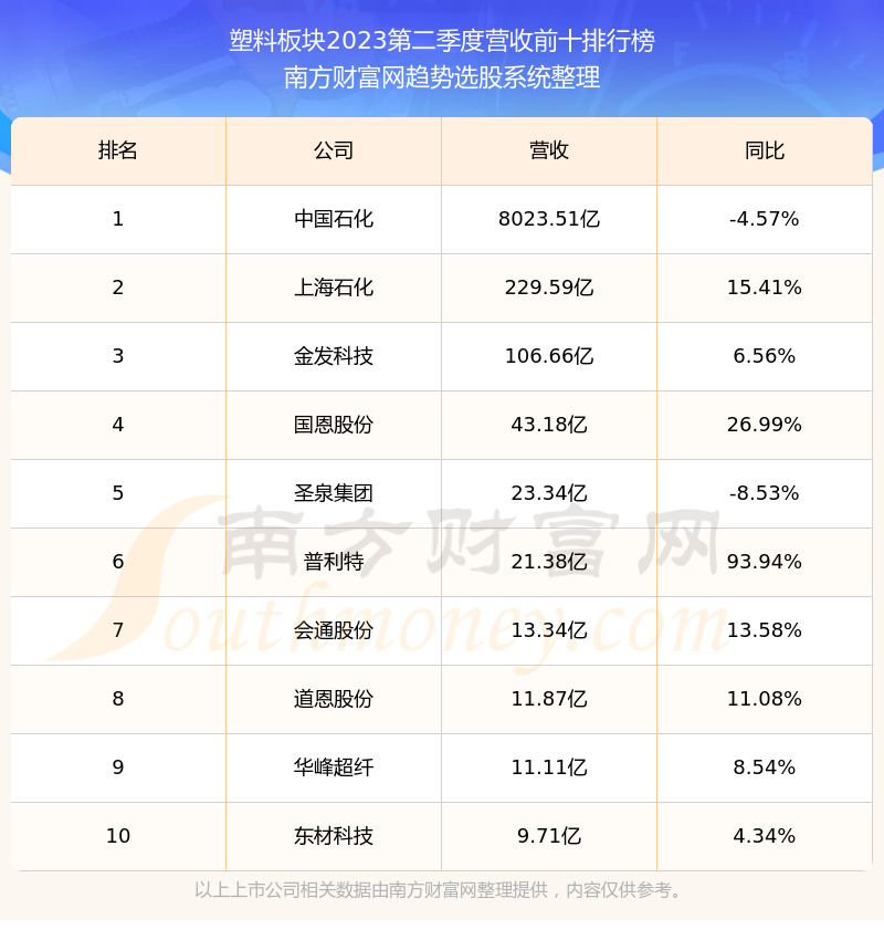 按照南方财富网趋势选股系统统计,该股所属板块为塑料板块,该板块共有37只股票,上海石化2023第二季度营收在该板块中排名为第2名,该板块2023第二季度营收排名前十的股票如下表:
