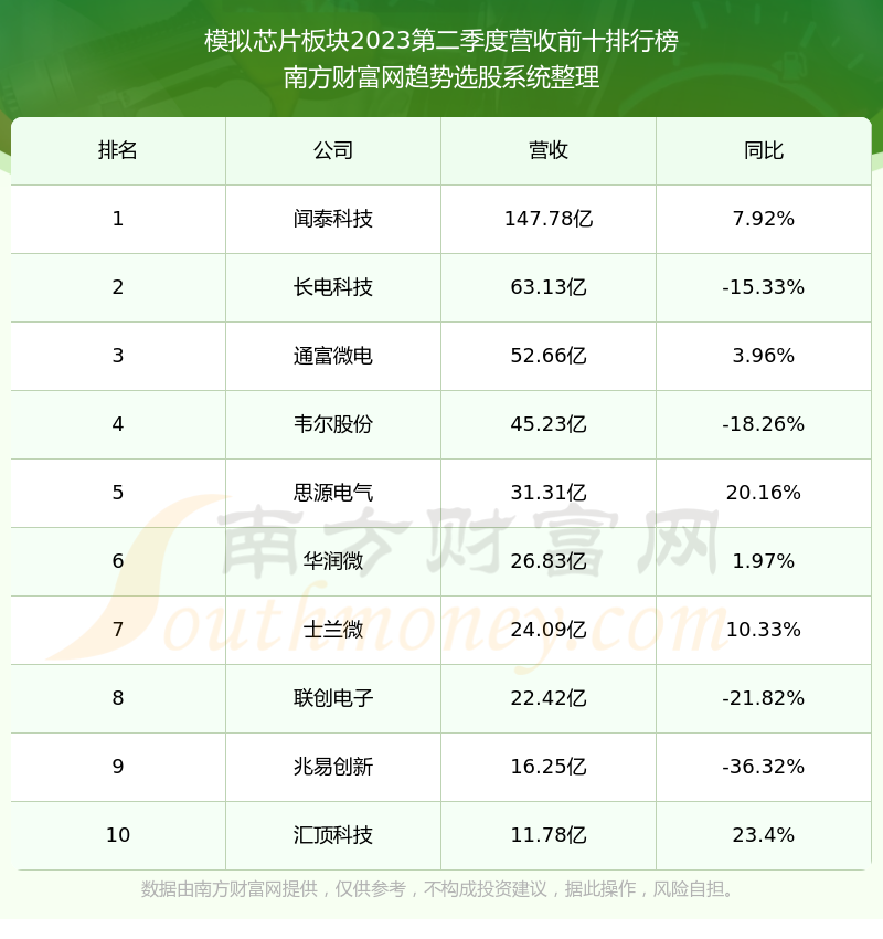 按照南方财富网趋势选股系统统计,该股所属板块为模拟芯片板块,该板块共有34只股票,思瑞浦2023第二季度营收在该板块中排名为第25名,该板块2023第二季度营收排名前十的股票如下表: