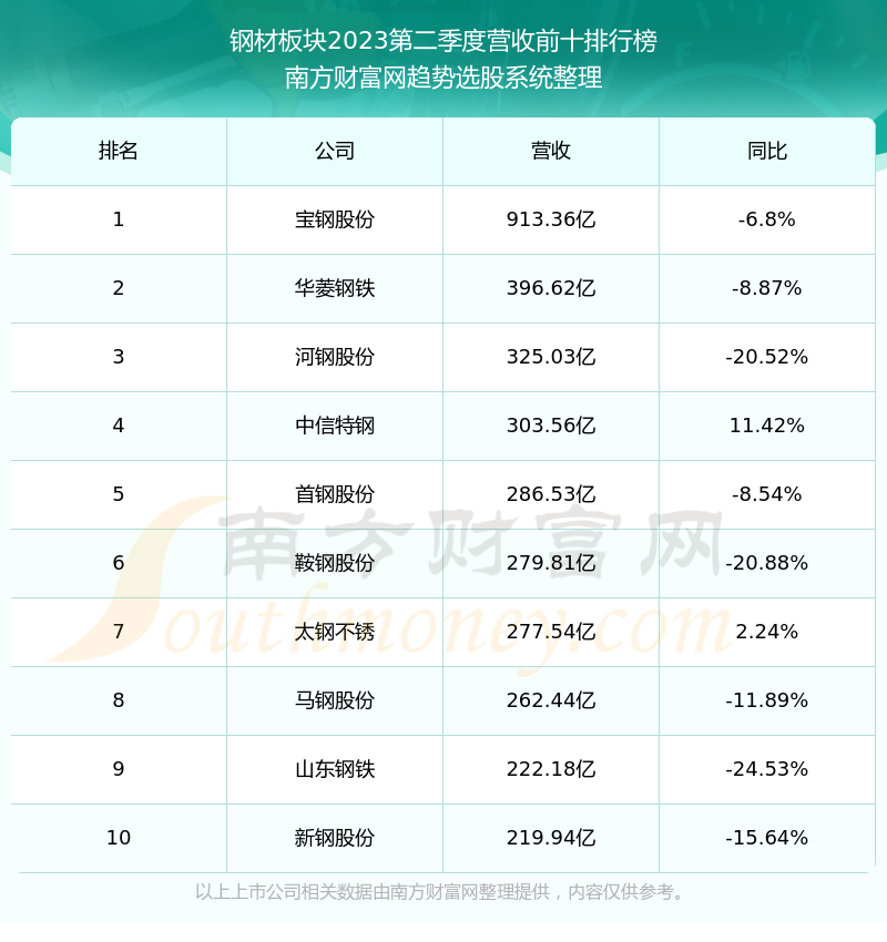 按照南方财富网趋势选股系统统计,该股所属板块为钢材板块,该板块共有30只股票,*ST园城2023第二季度营收在该板块中排名为第30名,该板块2023第二季度营收排名前十的股票如下表: