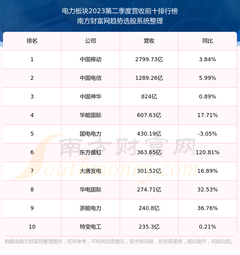 按照南方财富网趋势选股系统统计,该股所属板块为电力板块,该板块共有138只股票,华银电力2023第二季度营收在该板块中排名为第59名,该板块2023第二季度营收排名前十的股票如下表: