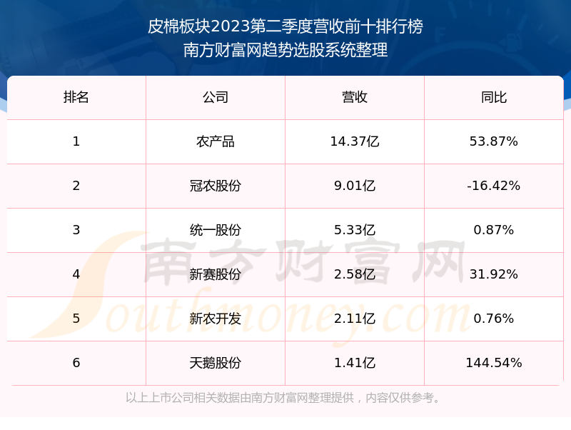 按照南方财富网趋势选股系统统计,该股所属板块为皮棉板块,该板块共有6只股票,冠农股份2023第二季度营收在该板块中排名为第2名,该板块2023第二季度营收排名前十的股票如下表: