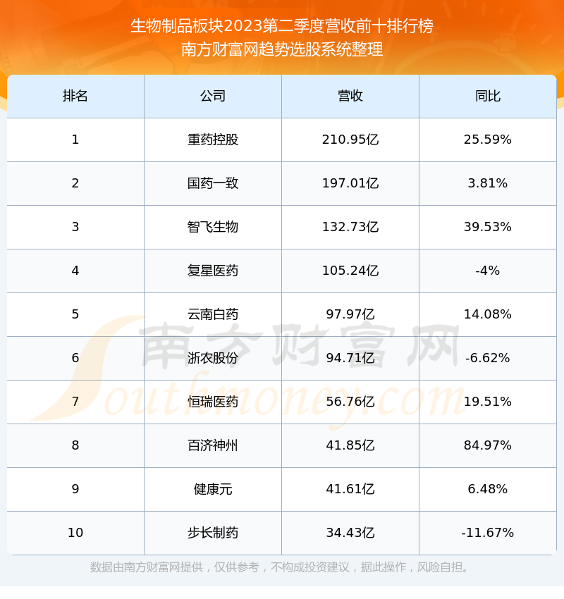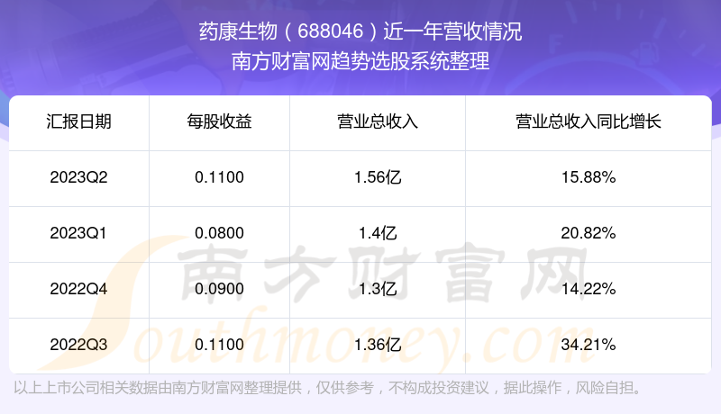 按照南方财富网趋势选股系统统计,该股所属板块为生物制品板块,该板块共有104只股票,药康生物2023第二季度营收在该板块中排名为第71名,该板块2023第二季度营收排名前十的股票如下表: