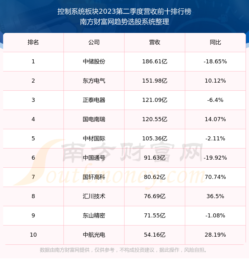 按照南方财富网趋势选股系统统计,该股所属板块为控制系统板块,该板块共有170只股票,瑞松科技2023第二季度营收在该板块中排名为第170名,该板块2023第二季度营收排名前十的股票如下表: