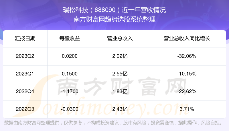 瑞松科技(688090)披露2023年第二季度报告,报告期实现营收2.02亿元,同比-32.06%;归母净利润75.13万元,同比-93.05%;扣非净利润-135.16万元,同比-114.25%;基本每股收益0.02元。
