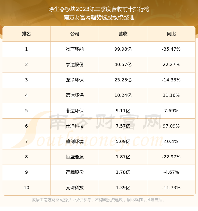 按照南方财富网趋势选股系统统计,该股所属板块为除尘器板块,该板块共有12只股票,龙净环保2023第二季度营收在该板块中排名为第3名,该板块2023第二季度营收排名前十的股票如下表: