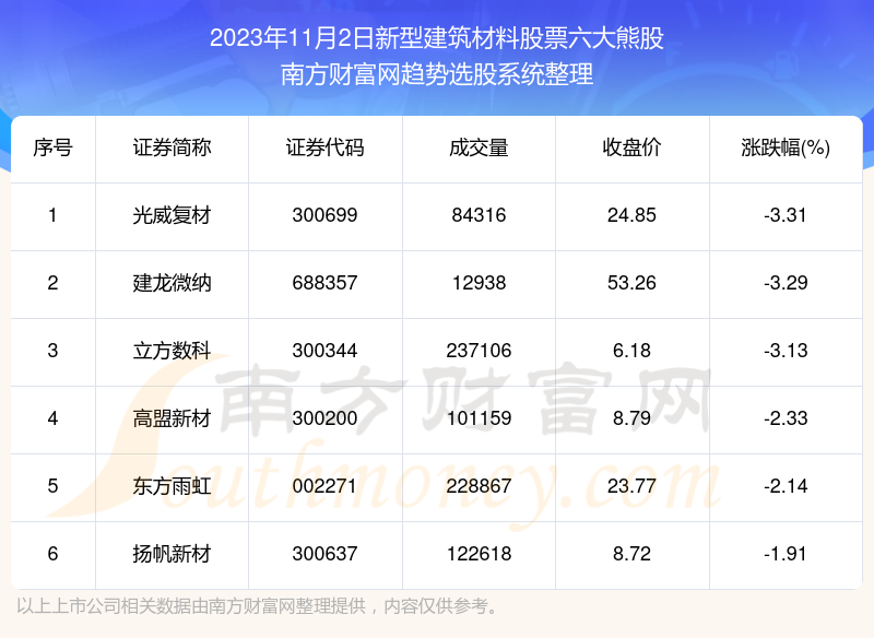 截止2023年11月2日,个股表现方面,新型建筑材料股票当日领跌股为光威复材(300699),该股当日报收24.85,上涨-3.31%,成交量8.43万。建龙微纳(688357)以下跌-3.29%紧随其后,该股当日成交量1.29万。此外,立方数科(300344)、高盟新材(300200)、东方雨虹(002271)均进入当日新型建筑材料股票熊股之列。