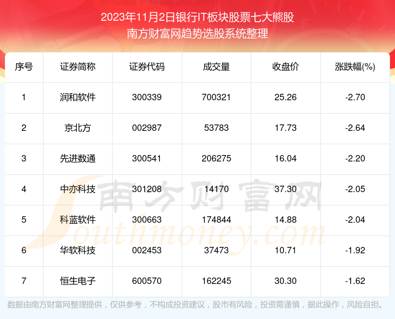 截止2023年11月2日,个股表现方面,银行IT板块股票当日领跌股为润和软件(300339),该股当日报收25.26,上涨-2.70%,成交量70.03万。京北方(002987)以下跌-2.64%紧随其后,该股当日成交量5.38万。此外,先进数通(300541)、中亦科技(301208)、科蓝软件(300663)均进入当日银行IT板块股票熊股之列。