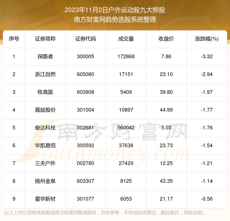 截止2023年11月2日,个股表现方面,户外运动股当日领跌股为探路者(300005),该股当日报收7.86,上涨-3.32%,成交量17.29万。浙江自然(605080)以下跌-2.94%紧随其后,该股当日成交量1.72万。此外,牧高笛(603908)、嘉益股份(301004)、奋达科技(002681)均进入当日户外运动股熊股之列。