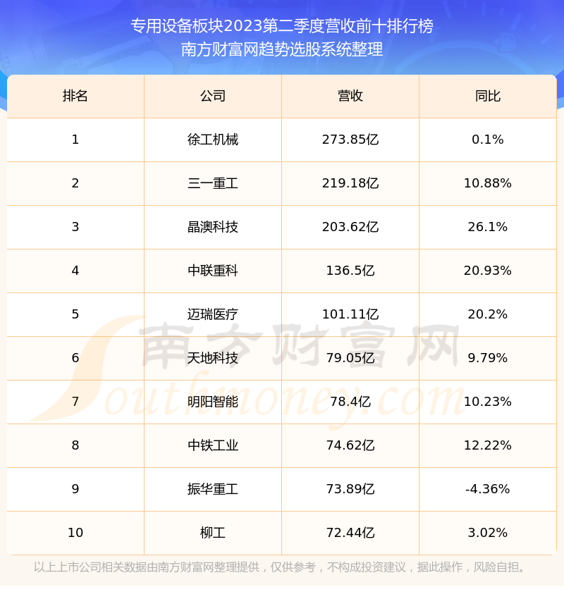 按照南方财富网趋势选股系统统计,该股所属板块为专用设备板块,该板块共有385只股票,国机通用2023第二季度营收在该板块中排名为第275名,该板块2023第二季度营收排名前十的股票如下表: