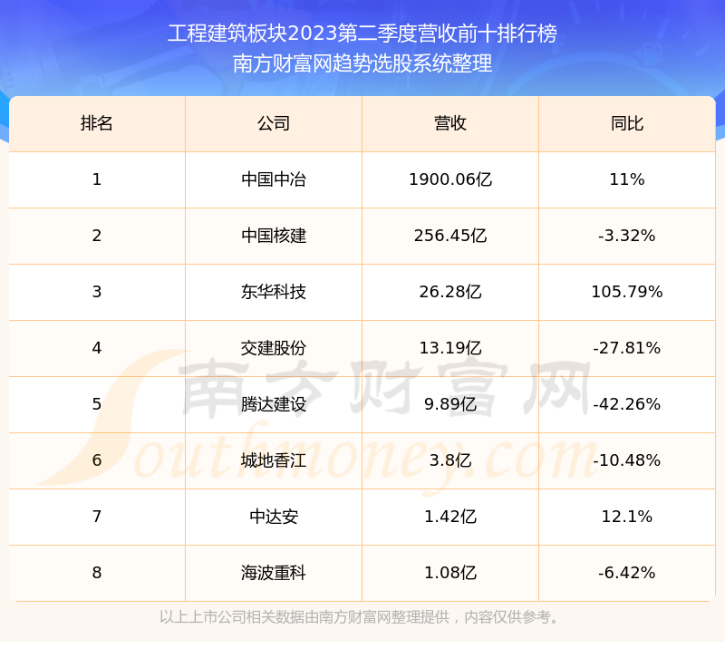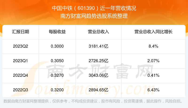 按照南方财富网趋势选股系统统计,该股所属板块为工程建筑板块,该板块共有8只股票,中国中铁2023第二季度营收在该板块中排名为第8名,该板块2023第二季度营收排名前十的股票如下表: