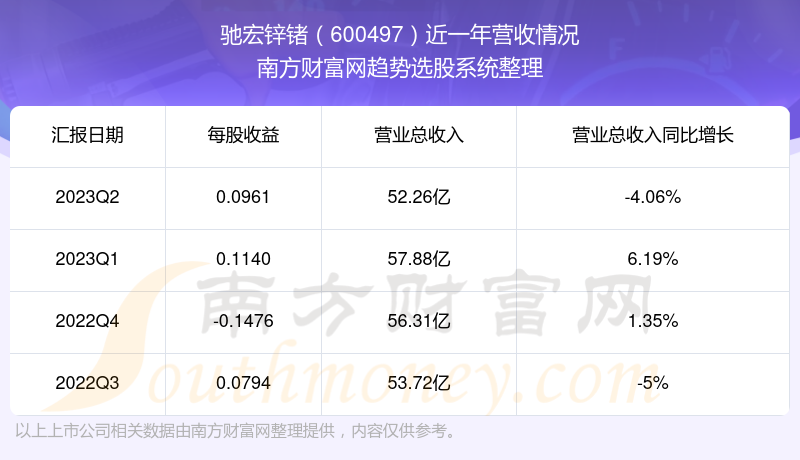 驰宏锌锗2023年第二季度显示,公司主营收入52.26亿元,同比-4.06%;归母净利润4.89亿元,同比4.01%;扣非净利润4.52亿元,同比-6.2%。