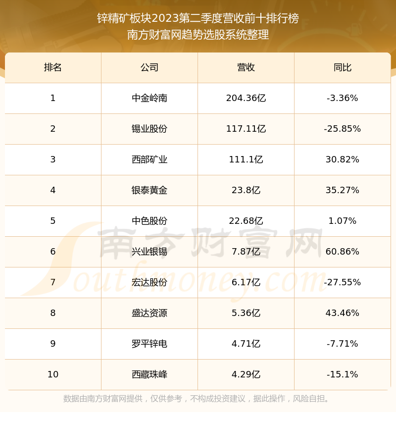 按照南方财富网趋势选股系统统计,该股所属板块为锌精矿板块,该板块共有12只股票,驰宏锌锗2023第二季度营收在该板块中排名为第12名,该板块2023第二季度营收排名前十的股票如下表: