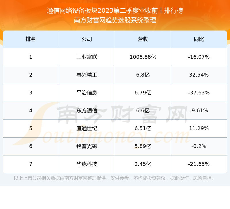 按照南方财富网趋势选股系统统计,该股所属板块为通信网络设备板块,该板块共有7只股票,华脉科技2023第二季度营收在该板块中排名为第7名,该板块2023第二季度营收排名前十的股票如下表:
