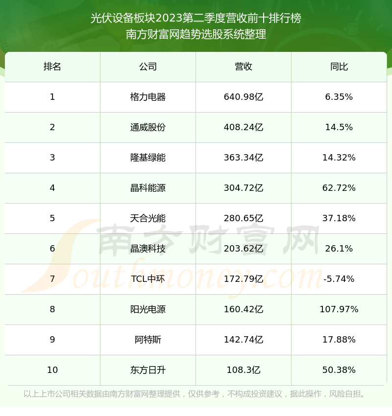按照南方财富网趋势选股系统统计,该股所属板块为光伏设备板块,该板块共有117只股票,金博股份2023第二季度营收在该板块中排名为第98名,该板块2023第二季度营收排名前十的股票如下表: