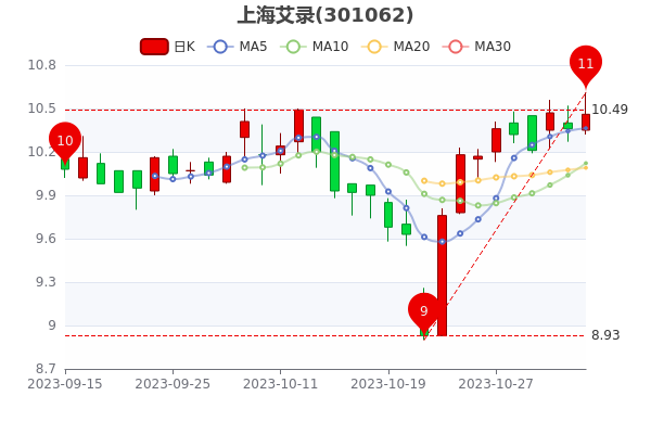 11月3日上海艾录开盘报价10.35元,收盘于10.460元,涨0.97%。当日最高价为10.61元,最低达10.32元,成交量386.77万手,总市值为41.88亿元。