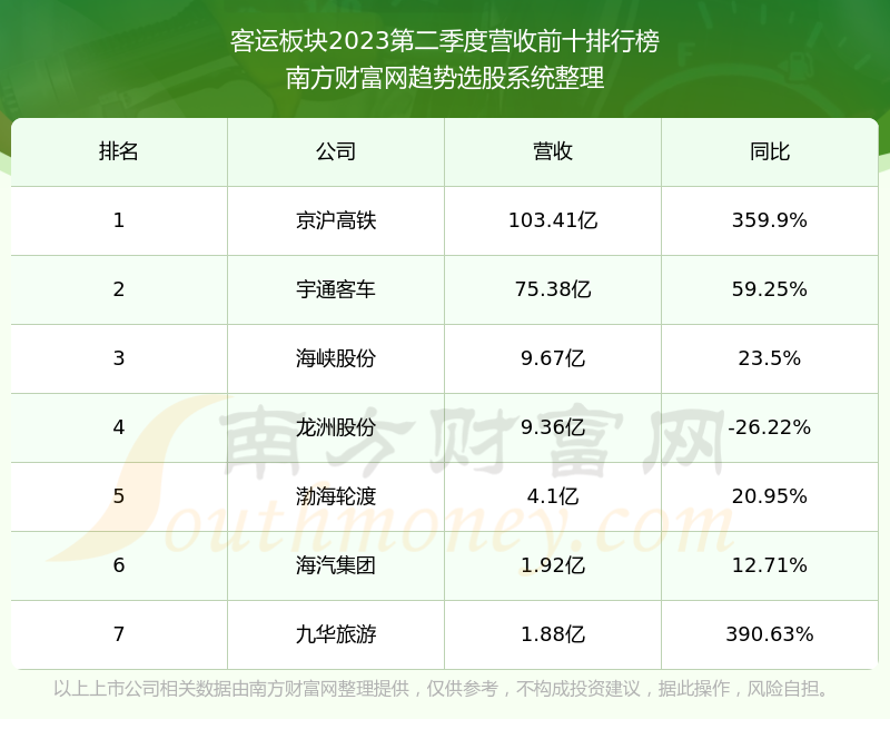 按照南方财富网趋势选股系统统计,该股所属板块为客运板块,该板块共有7只股票,天宸股份2023第二季度营收在该板块中排名为第7名,该板块2023第二季度营收排名前十的股票如下表: