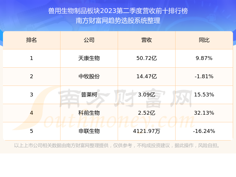 按照南方财富网趋势选股系统统计,该股所属板块为兽用生物制品板块,该板块共有5只股票,申联生物2023第二季度营收在该板块中排名为第5名,该板块2023第二季度营收排名前十的股票如下表: