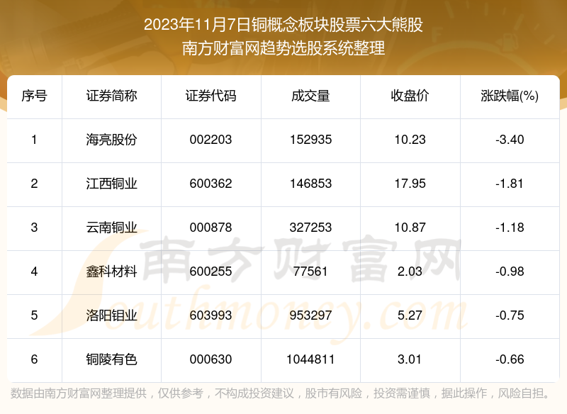 截止2023年11月7日,个股表现方面,铜概念板块股票当日领跌股为海亮股份(002203),该股当日报收10.23,上涨-3.40%,成交量15.29万。江西铜业(600362)以下跌-1.81%紧随其后,该股当日成交量14.69万。此外,云南铜业(000878)、鑫科材料(600255)、洛阳钼业(603993)均进入当日铜概念板块股票熊股之列。