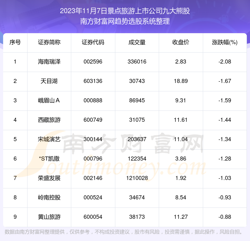 截止2023年11月7日,个股表现方面,景点旅游上市公司当日领跌股为海南瑞泽(002596),该股当日报收2.83,上涨-2.08%,成交量33.6万。天目湖(603136)以下跌-1.67%紧随其后,该股当日成交量3.07万。此外,峨眉山A(000888)、西藏旅游(600749)、宋城演艺(300144)均进入当日景点旅游上市公司熊股之列。
