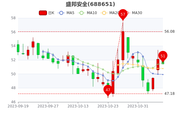 盛邦安全(688651)跌1.17%,报51.750元,成交额1453.07万元,换手率1.77%,振幅跌0.69%。