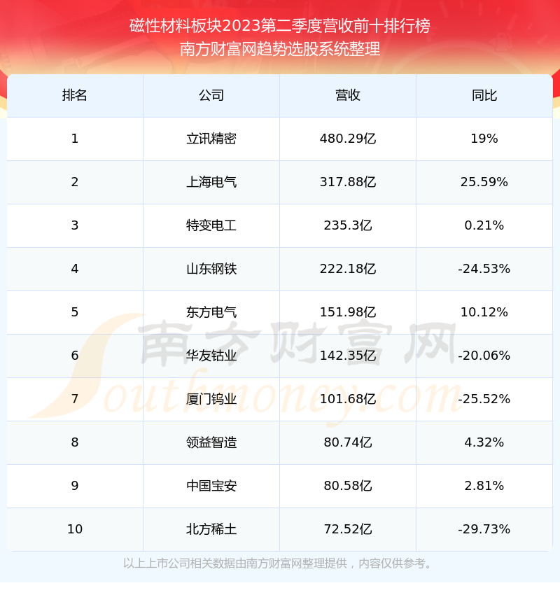 按照南方财富网趋势选股系统统计,该股所属板块为磁性材料板块,该板块共有34只股票,金田股份2023第二季度营收在该板块中排名为第34名,该板块2023第二季度营收排名前十的股票如下表: