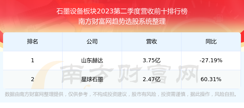 按照南方财富网趋势选股系统统计,该股所属板块为石墨设备板块,该板块共有2只股票,星球石墨2023第二季度营收在该板块中排名为第2名,该板块2023第二季度营收排名前十的股票如下表: