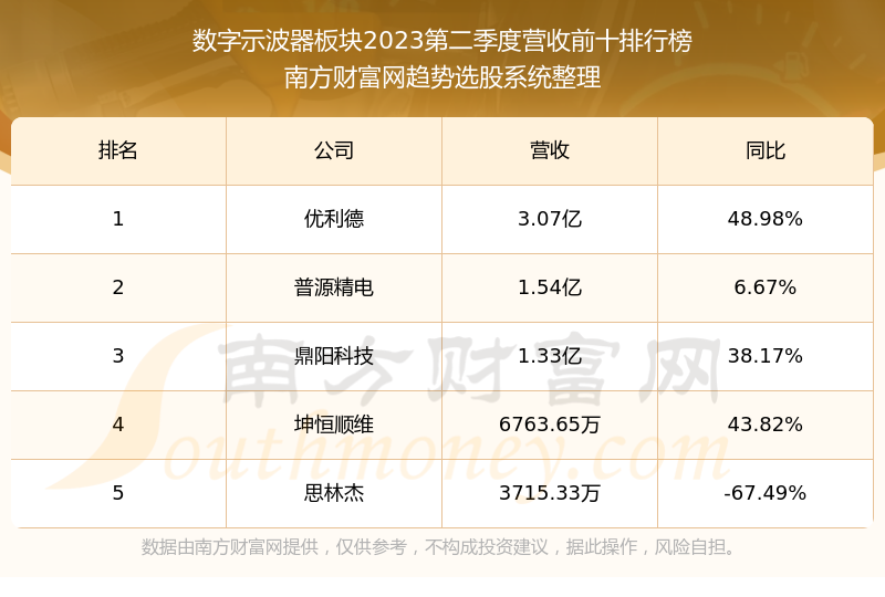 按照南方财富网趋势选股系统统计,该股所属板块为数字示波器板块,该板块共有5只股票,普源精电2023第二季度营收在该板块中排名为第2名,该板块2023第二季度营收排名前十的股票如下表: