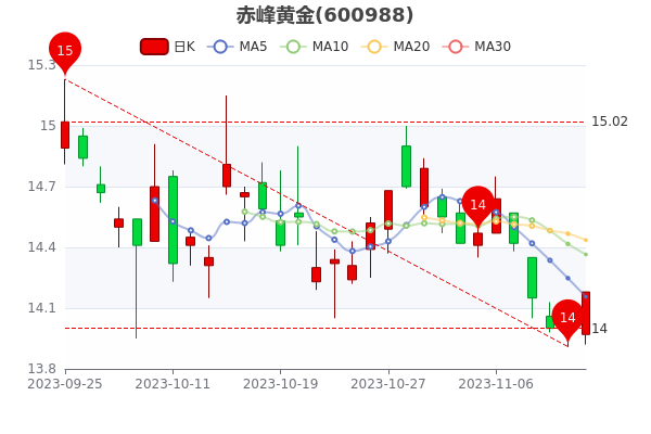 11月13日消息,赤峰黄金5日内股价下跌1.69%,最新报14.180元,成交量1374.18万手,总市值为235.94亿元。