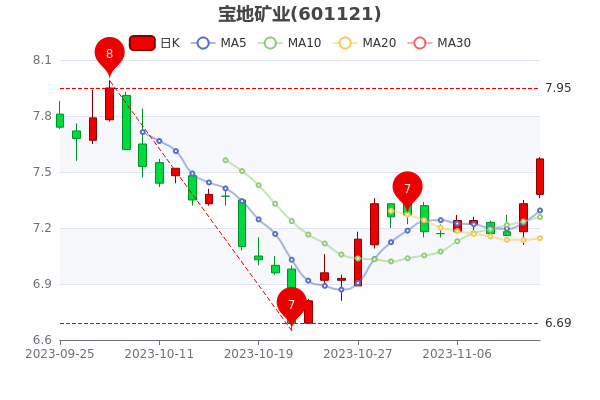 11月13日宝地矿业开盘报价7.38元,收盘于7.570元,涨3.27%。当日最高价为7.58元,最低达7.36元,成交量1625.41万手,总市值为60.56亿元。