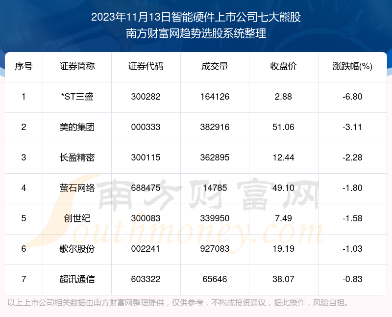 截止2023年11月13日,个股表现方面,智能硬件上市公司当日领跌股为*ST三盛(300282),该股当日报收2.88,上涨-6.80%,成交量16.41万。美的集团(000333)以下跌-3.11%紧随其后,该股当日成交量38.29万。此外,长盈精密(300115)、萤石网络(688475)、创世纪(300083)均进入当日智能硬件上市公司熊股之列。