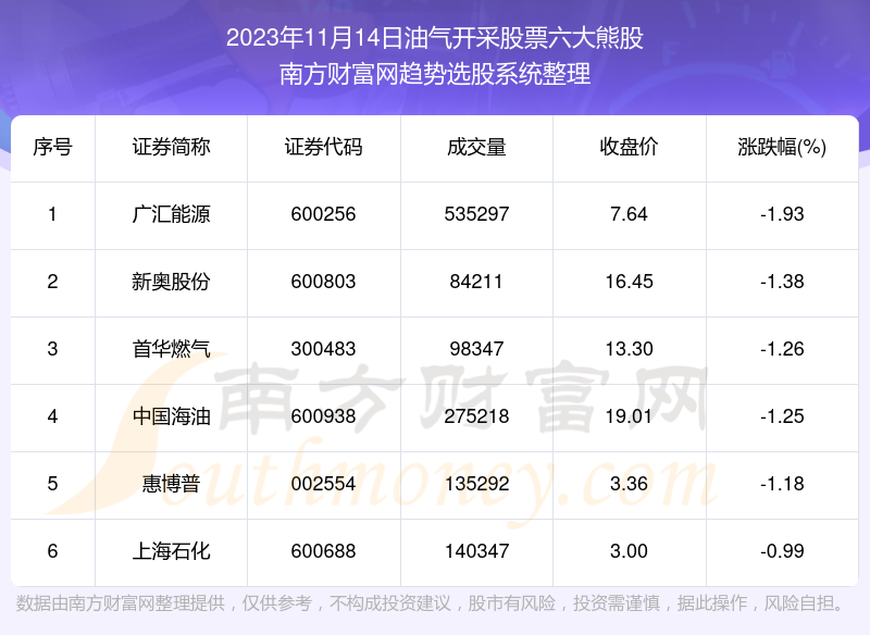 截止2023年11月14日,个股表现方面,油气开采股票当日领跌股为广汇能源(600256),该股当日报收7.64,上涨-1.93%,成交量53.53万。新奥股份(600803)以下跌-1.38%紧随其后,该股当日成交量8.42万。此外,首华燃气(300483)、中国海油(600938)、惠博普(002554)均进入当日油气开采股票熊股之列。