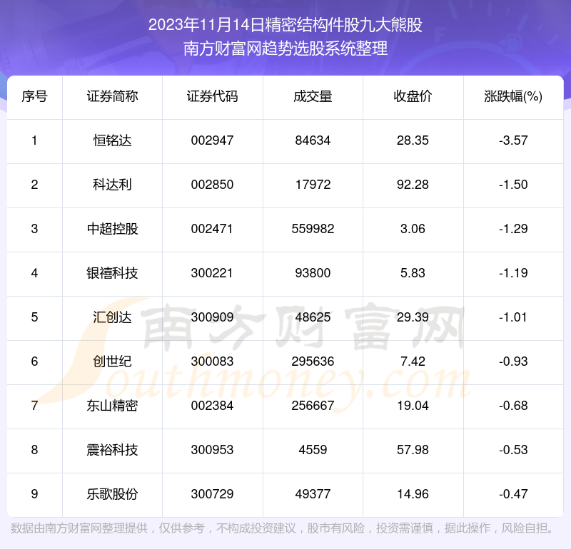 截止2023年11月14日,个股表现方面,精密结构件股当日领跌股为恒铭达(002947),该股当日报收28.35,上涨-3.57%,成交量8.46万。科达利(002850)以下跌-1.50%紧随其后,该股当日成交量1.8万。此外,中超控股(002471)、银禧科技(300221)、汇创达(300909)均进入当日精密结构件股熊股之列。