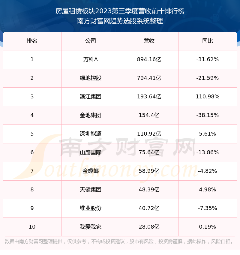 按照南方财富网趋势选股系统统计,该股所属板块为房屋租赁板块,该板块共有30只股票,汇通能源2023第三季度营收在该板块中排名为第30名,该板块2023第三季度营收排名前十的股票如下表: