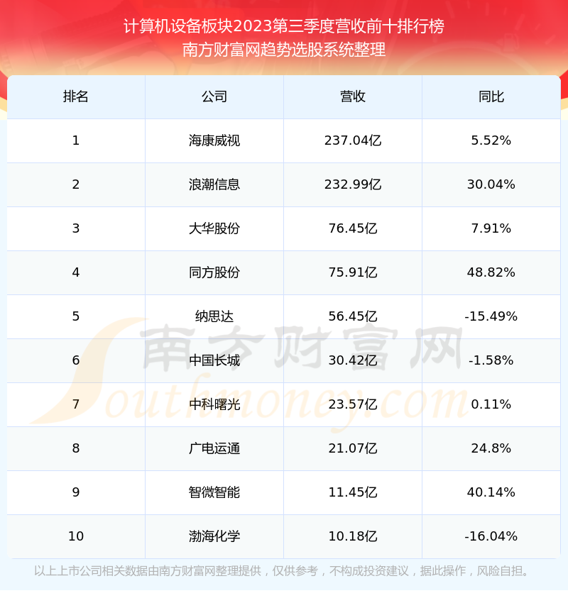 按照南方财富网趋势选股系统统计,该股所属板块为计算机设备板块,该板块共有62只股票,苏州科达2023第三季度营收在该板块中排名为第23名,该板块2023第三季度营收排名前十的股票如下表:
