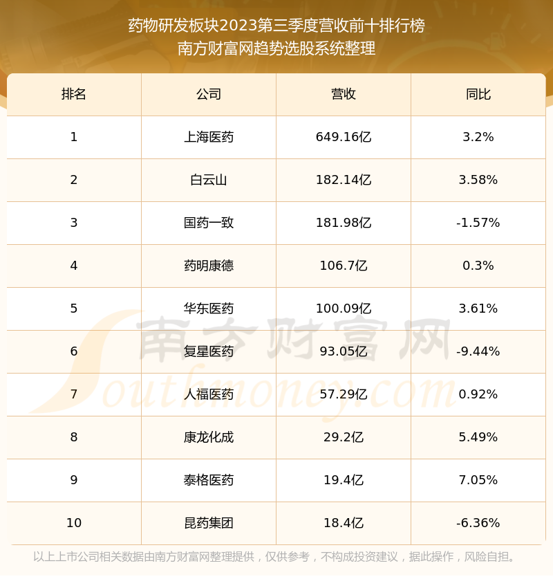 按照南方财富网趋势选股系统统计,该股所属板块为药物研发板块,该板块共有73只股票,成都先导2023第三季度营收在该板块中排名为第64名,该板块2023第三季度营收排名前十的股票如下表:
