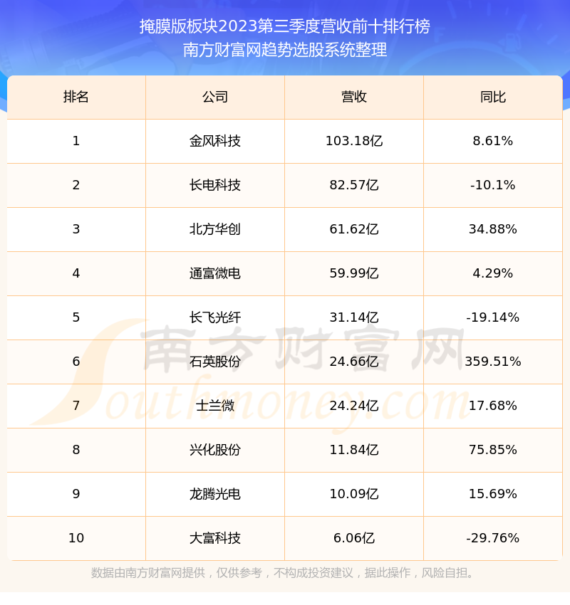 按照南方财富网趋势选股系统统计,该股所属板块为掩膜版板块,该板块共有21只股票,路维光电2023第三季度营收在该板块中排名为第18名,该板块2023第三季度营收排名前十的股票如下表: