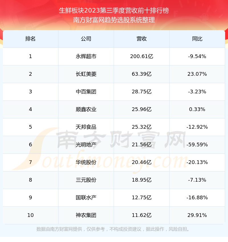 按照南方财富网趋势选股系统统计,该股所属板块为生鲜板块,该板块共有19只股票,三江购物2023第三季度营收在该板块中排名为第11名,该板块2023第三季度营收排名前十的股票如下表:
