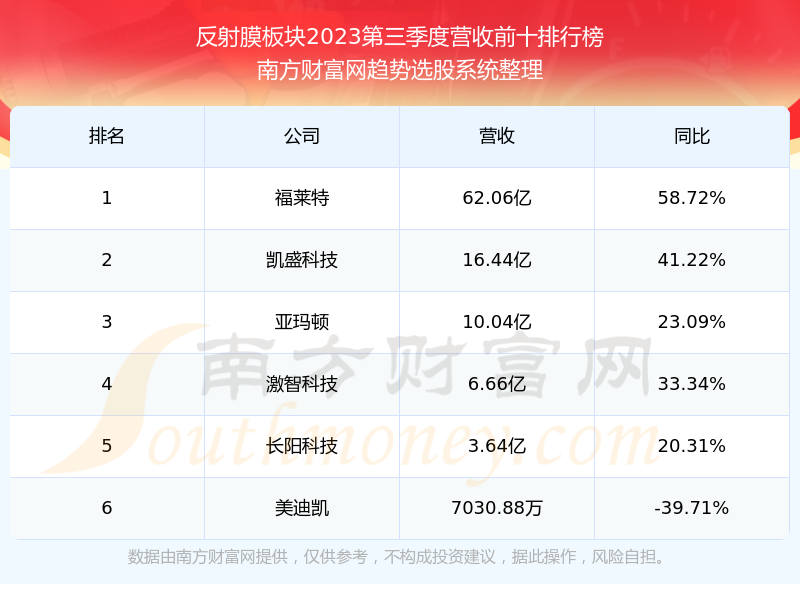 按照南方财富网趋势选股系统统计,该股所属板块为反射膜板块,该板块共有6只股票,长阳科技2023第三季度营收在该板块中排名为第5名,该板块2023第三季度营收排名前十的股票如下表: