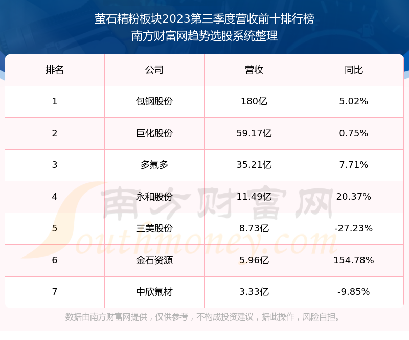 按照南方财富网趋势选股系统统计,该股所属板块为萤石精粉板块,该板块共有7只股票,金石资源2023第三季度营收在该板块中排名为第6名,该板块2023第三季度营收排名前十的股票如下表: