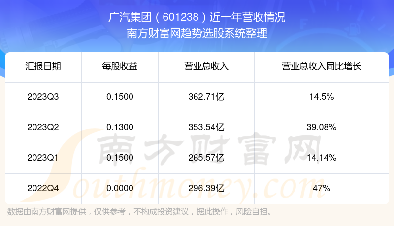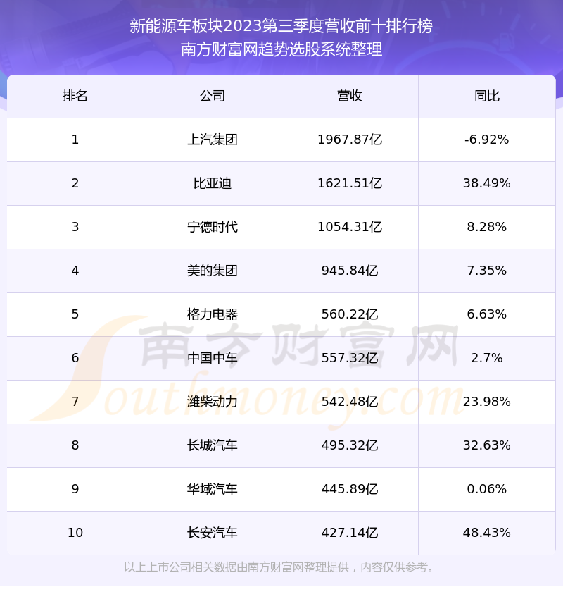 按照南方财富网趋势选股系统统计,该股所属板块为新能源车板块,该板块共有558只股票,广汽集团2023第三季度营收在该板块中排名为第11名,该板块2023第三季度营收排名前十的股票如下表:
