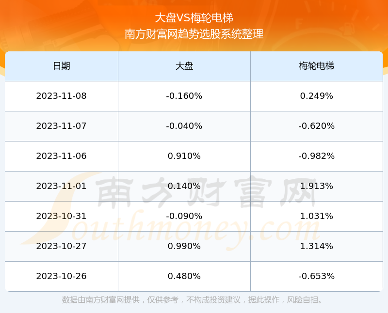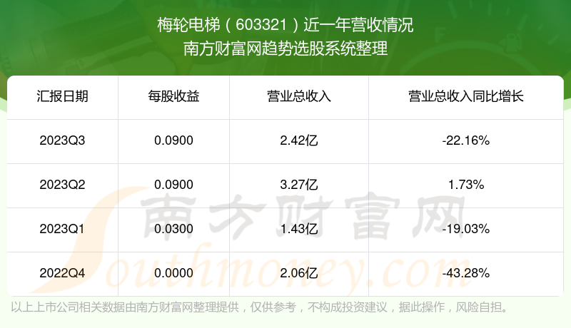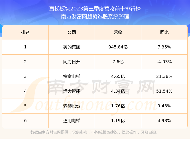 按照南方财富网趋势选股系统统计,该股所属板块为直梯板块,该板块共有6只股票,梅轮电梯2023第三季度营收在该板块中排名为第6名,该板块2023第三季度营收排名前十的股票如下表: