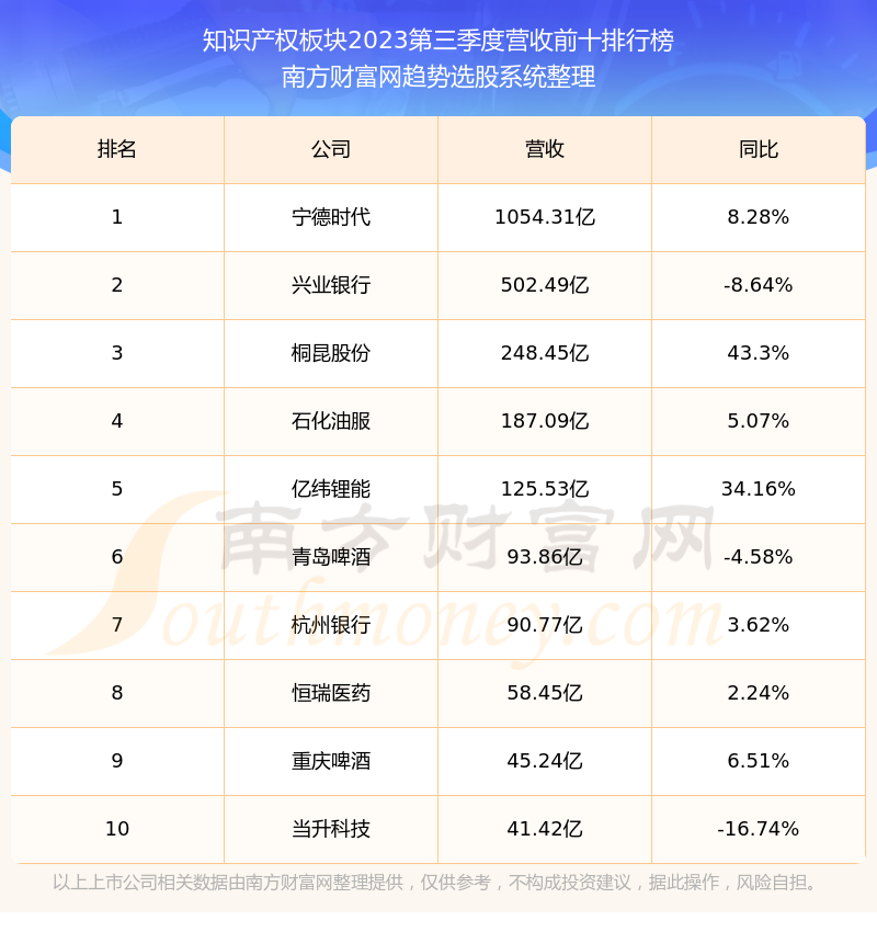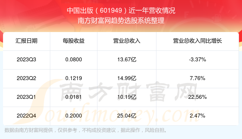 按照南方财富网趋势选股系统统计,该股所属板块为知识产权板块,该板块共有131只股票,中国出版2023第三季度营收在该板块中排名为第22名,该板块2023第三季度营收排名前十的股票如下表: