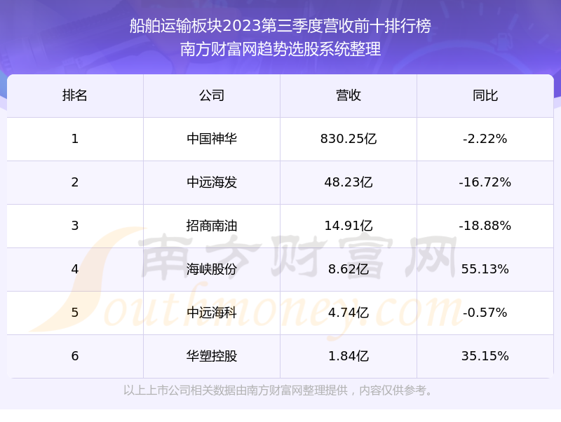 按照南方财富网趋势选股系统统计,该股所属板块为船舶运输板块,该板块共有6只股票,招商轮船2023第三季度营收在该板块中排名为第6名,该板块2023第三季度营收排名前十的股票如下表: